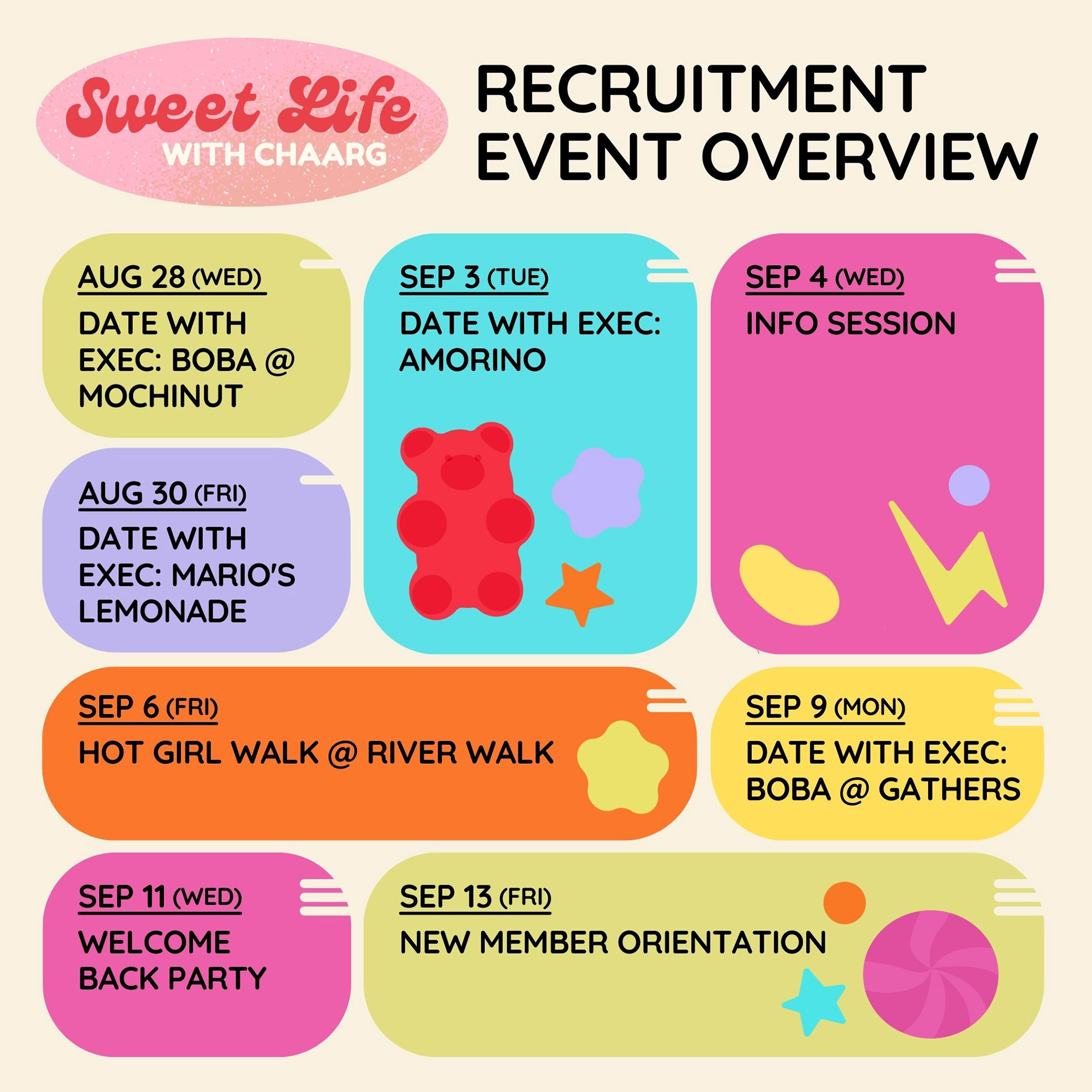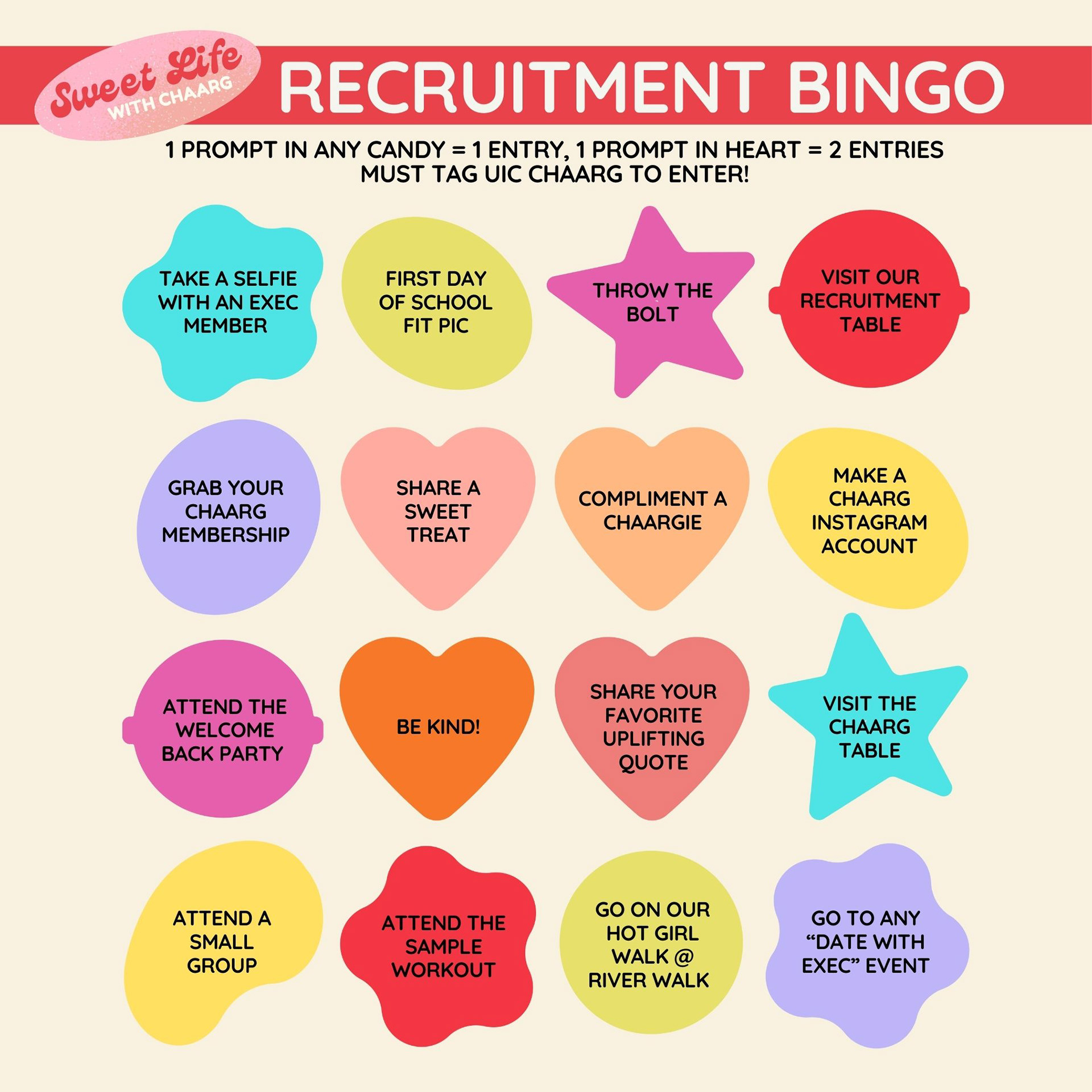 CHAARG at UIC is a womxn’s health and wellness club. Sweet Life with CHAARG was a recruitment campaign aimed to engage potential members on Instagram. My role as VP Media was to create the graphics and provide creative direction, ensuring a cohesive and visually appealing design that aligned with the campaign’s sweet, whimsical theme. Posts were created using Adobe Illustrator.
